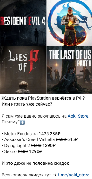 Cотрудничая с магазином Aoki Store, снижаем стоимость привлечения подписчика. Наши редакторы создают лояльную аудиторию, которая доверяет магазину и радует себя игровыми новинками.